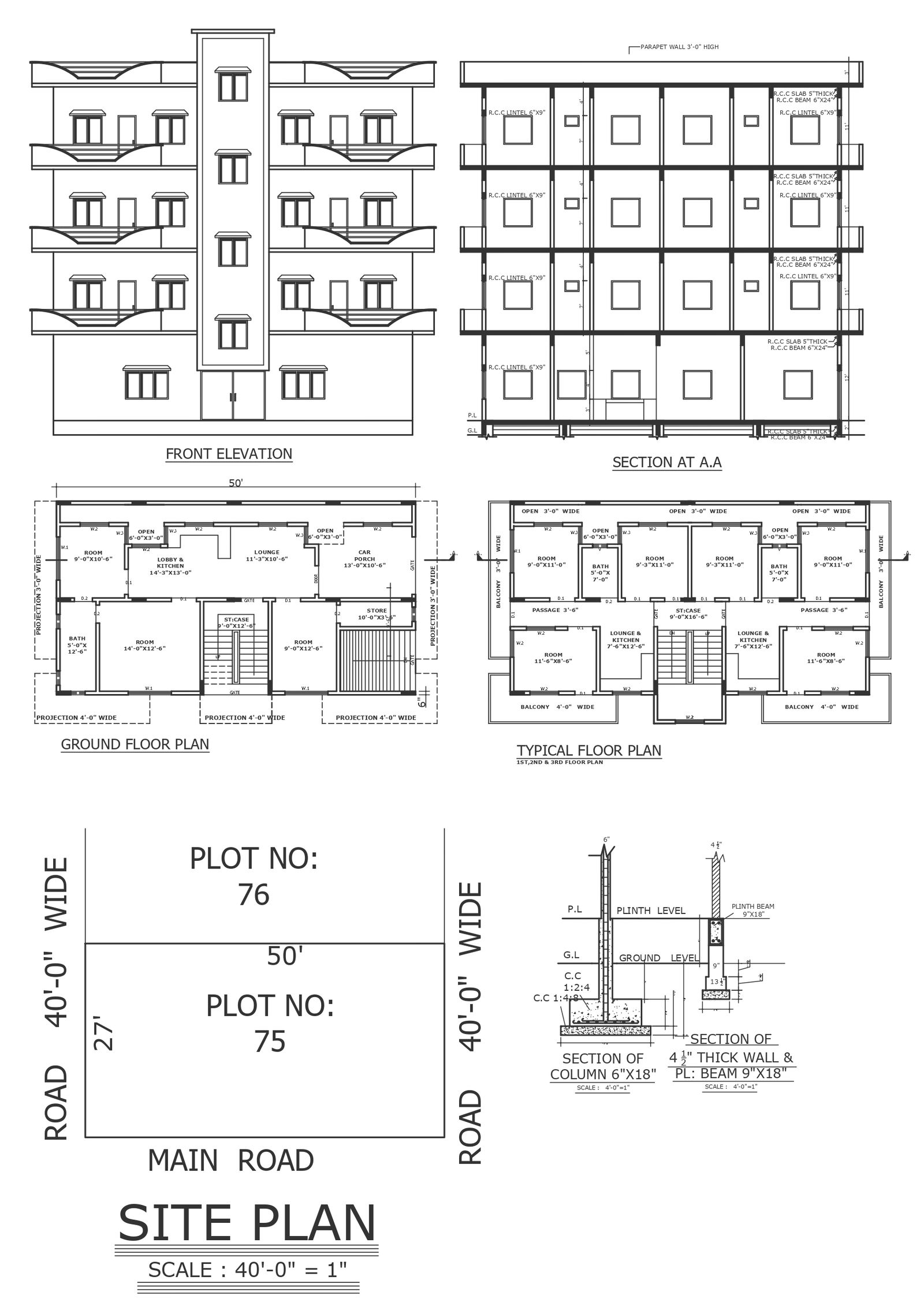 27ft X 50ft size three storey house plan section elevation detail with column section detail DWG AutoCAD drawing