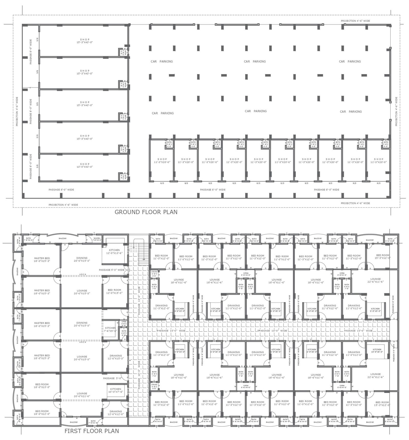 2bhk apartment design with 10ft wide passage detailed plan with shops layout on ground floor detail DWG AutoCAD drawing