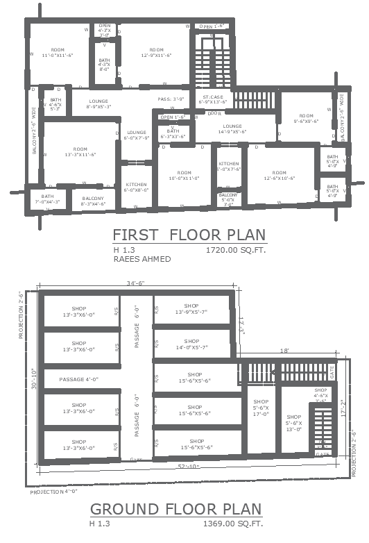 Commercial and recidencial space design in plot size of 1369sft detailed layout plan of ground floor and first floor DWG AutoCAD drawing
