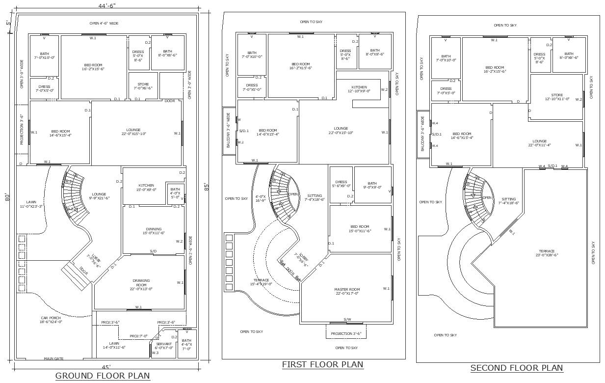Three storey house design in plot size of 45ft X 85ft with round terrace design conceptual detail layout plan DWG AutoCAD drawing
