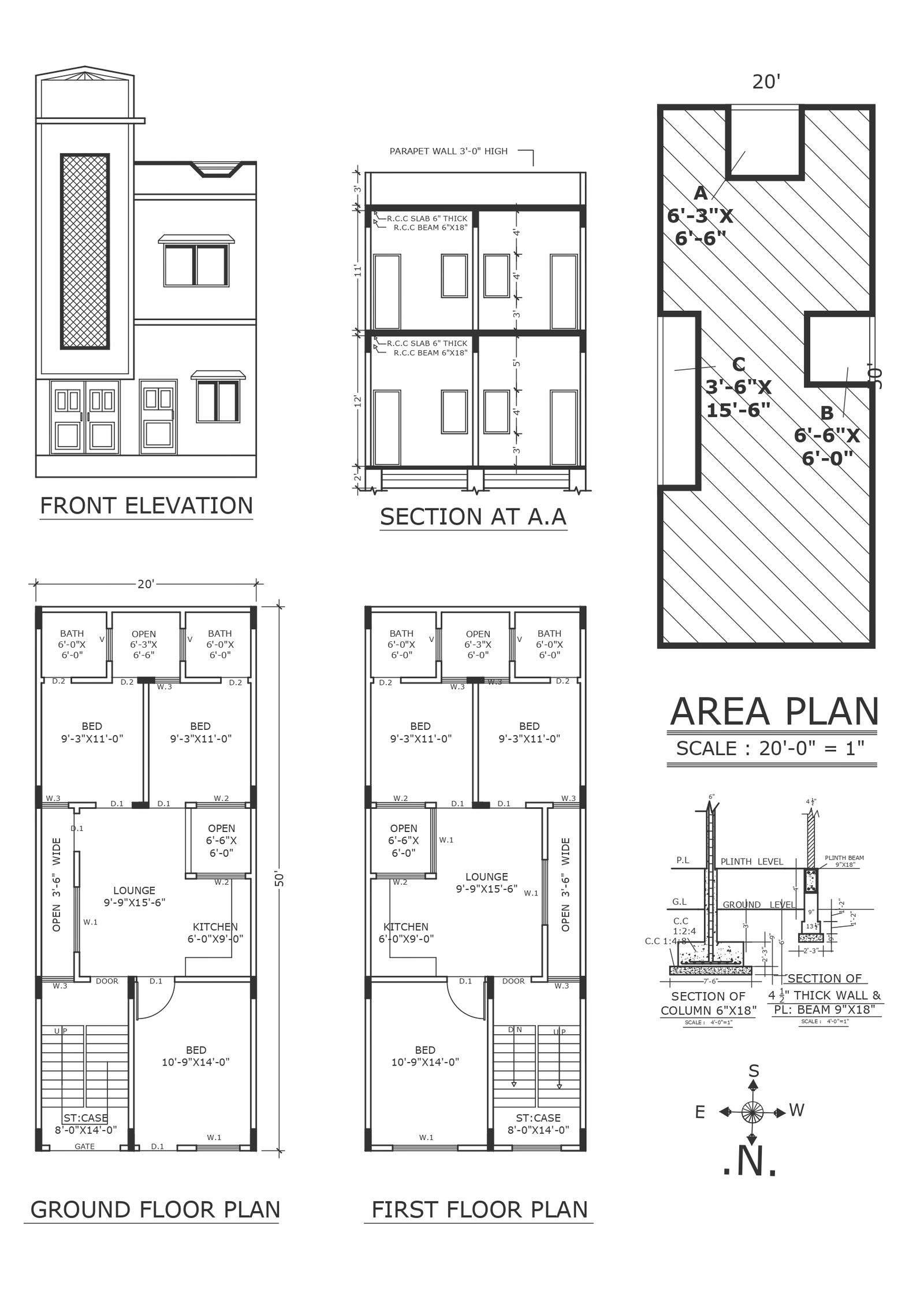 Double storey house design in plot size of 20ft X50ft with parapet wall detail plan section and elevationDWG AutoCAD drawing