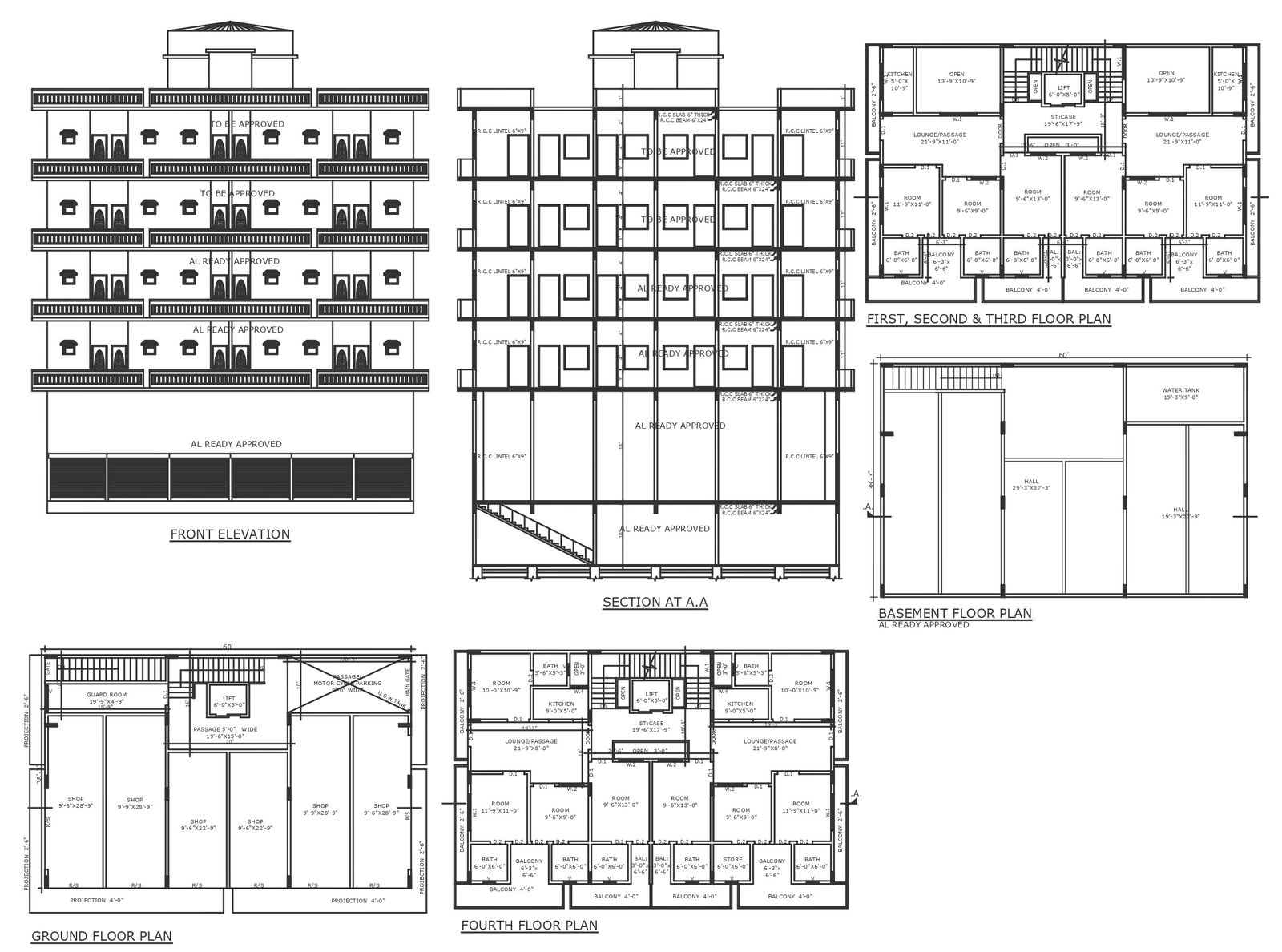 Five storey apartment design with under ground water tank detailed plan section and elevation DWG autoCAD drawing