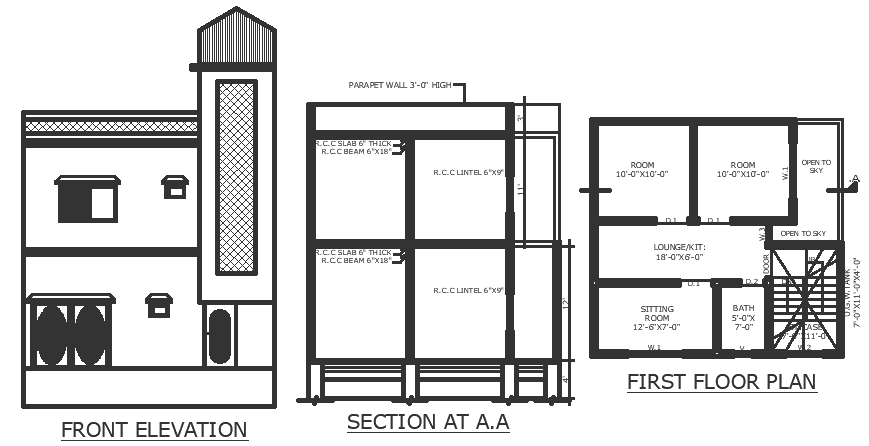 Single storey 2 BHK house plan with section and elevation detail of parapet wall DWG autoCAD drawing