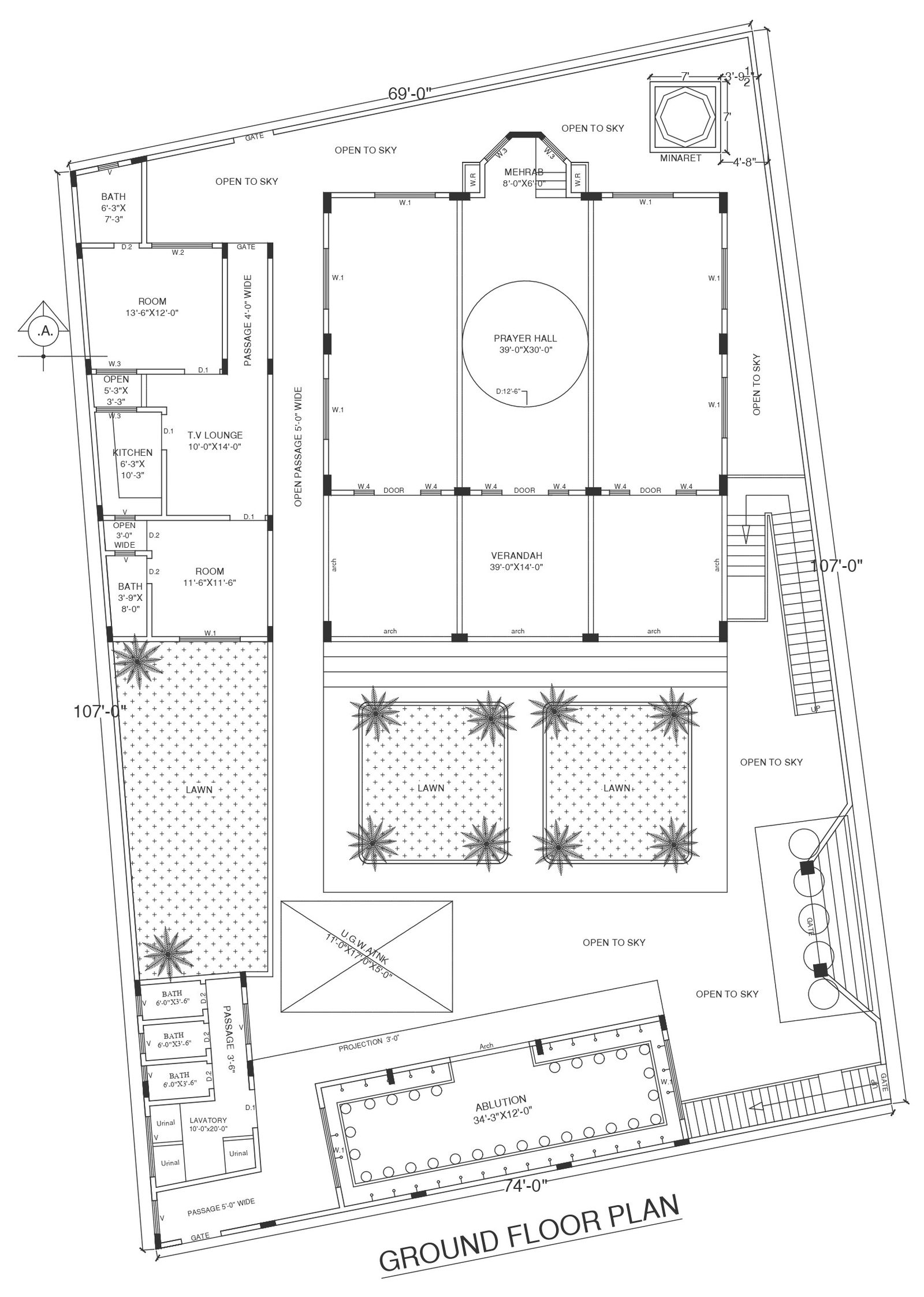 Masjid design on plot size of 74ft X 107ft detailed plan DWG autoCAD drawing