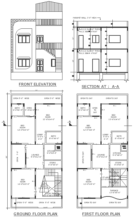 Double storey house plan with detail of brickwall in front elevation detailed all floor plan section and elevation DWG autoCAD drawing