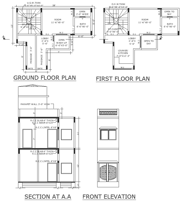 Double storey small house design detailed plan section and elevation DWG autoCAD drawing