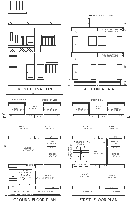 24ft X 45ft plot size two storey house design with under ground water tank detailed plan section and elevation DWG autoCAD drawing