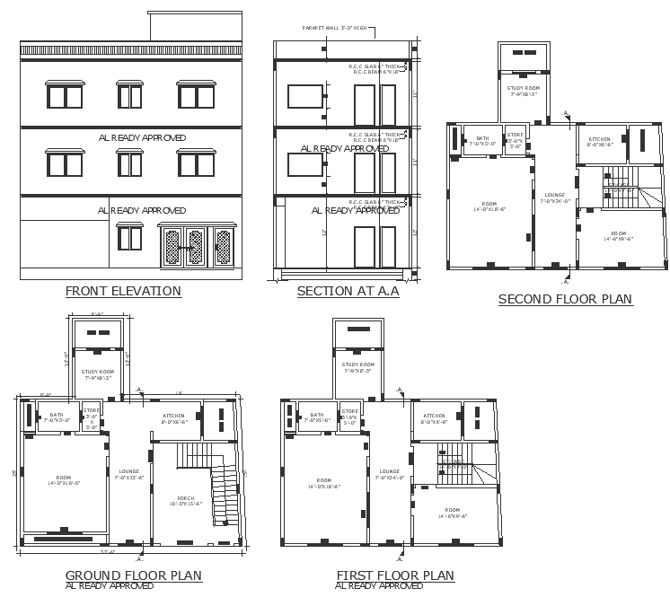 8ft X 9ft study room design in three storey bungalow detailed plan section and elevation DWG autoCAD drawing