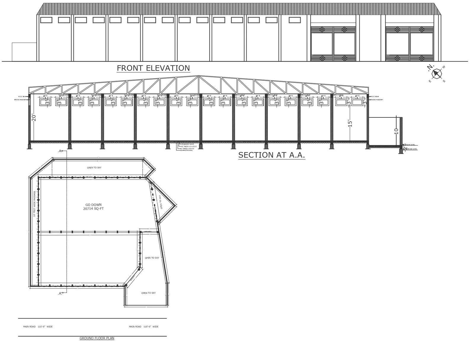 20714 sqft godown design just beside main road detailed plan section and elevation DWG autoCAD drawing