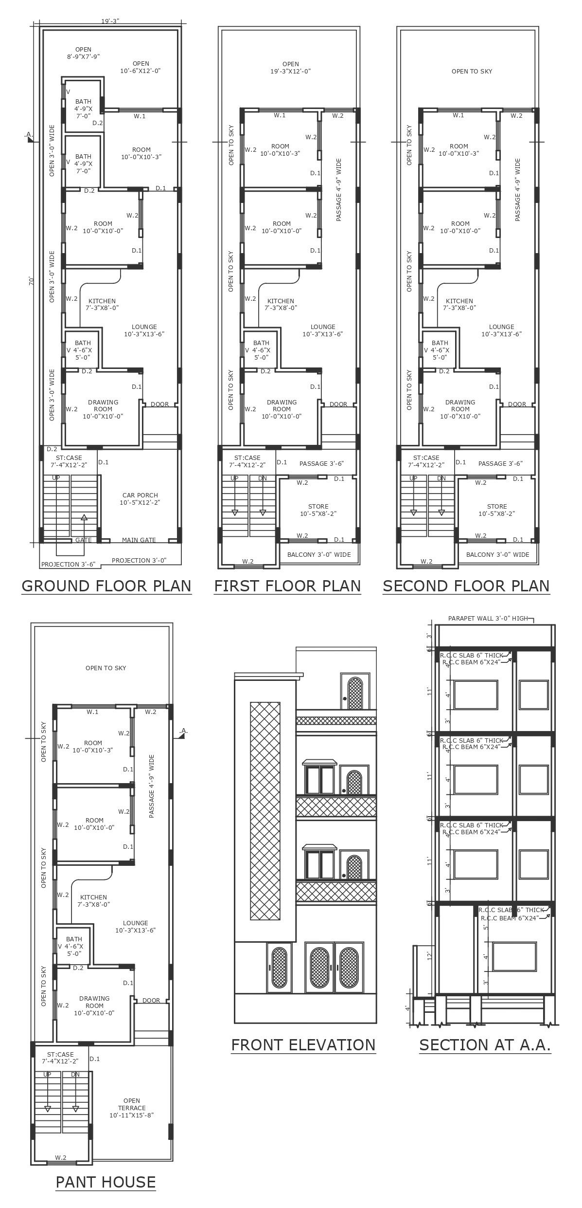 19ft X 70ft four storey house design detailed plan section elevation DWG autoCAD drawing
