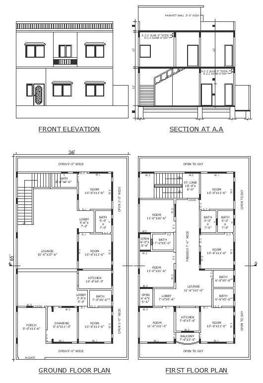36ft X 65ft luxurious bungalow design with 9 bedroom detailed plan section and elevation DWG autoCAD drawing