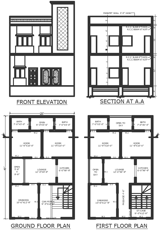 25ft X 40ft bungalow design with jali detail of staircase wall detailed floor plan section and elevation DWG autoCAD drawing