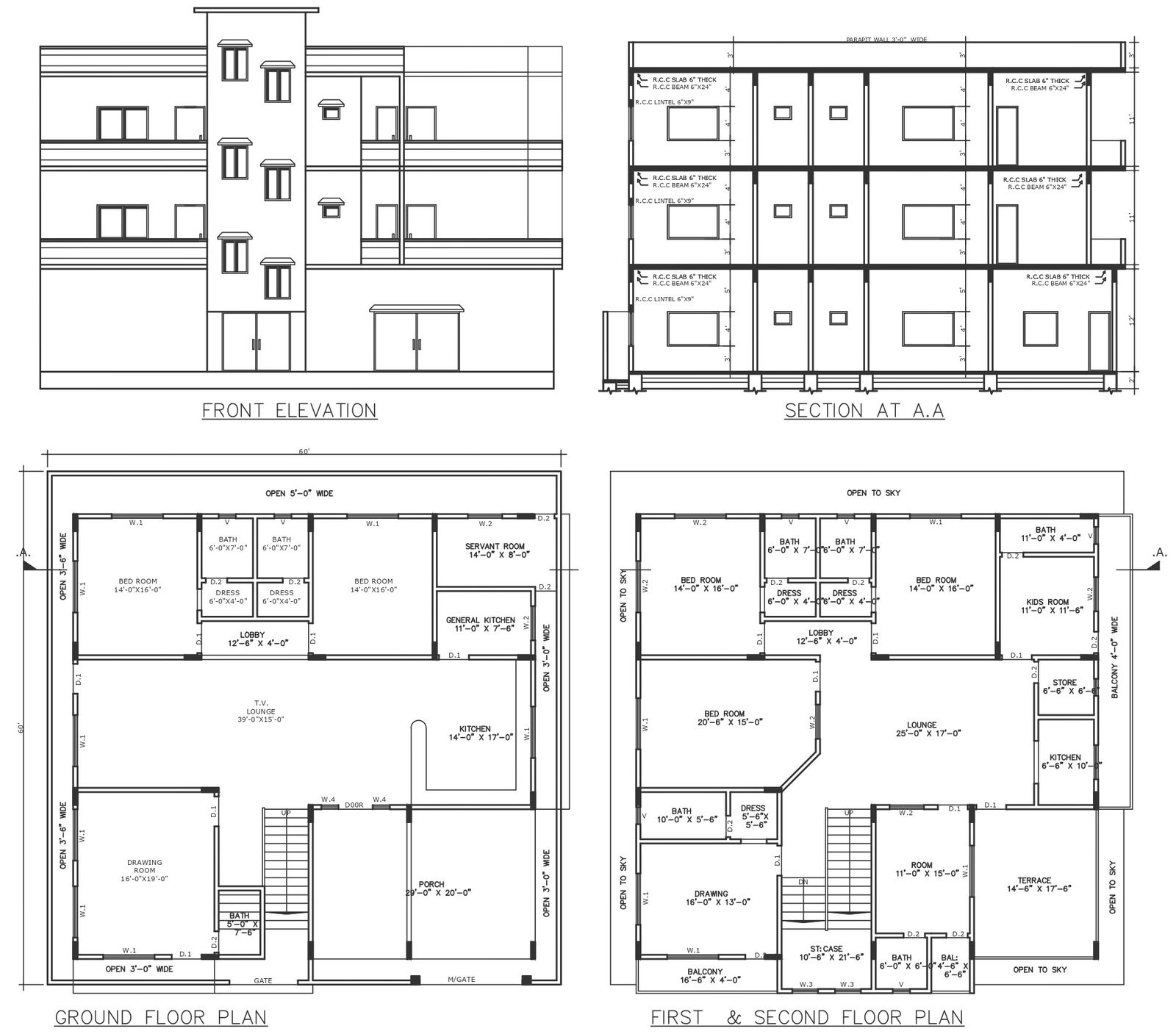 11ft highted bungalow design with detail of 6 X 24 inch beam DWG autoCAD drawing