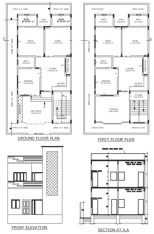 Lavish bungalow design with detailed layout plan section and elevation DWG autoCAD drawing