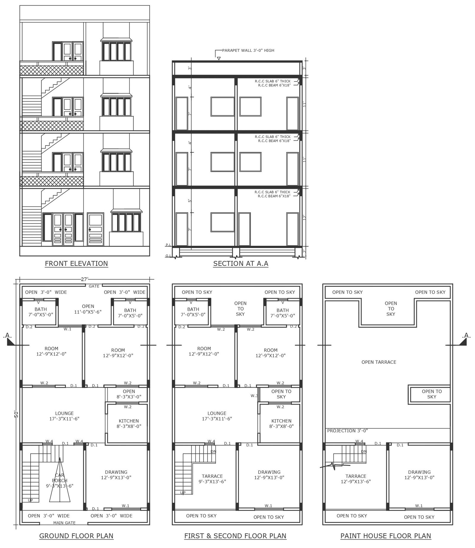 Penthouse design on three storey luxurious bungalow detailed plan section and elevation DWG autoCAD drawing