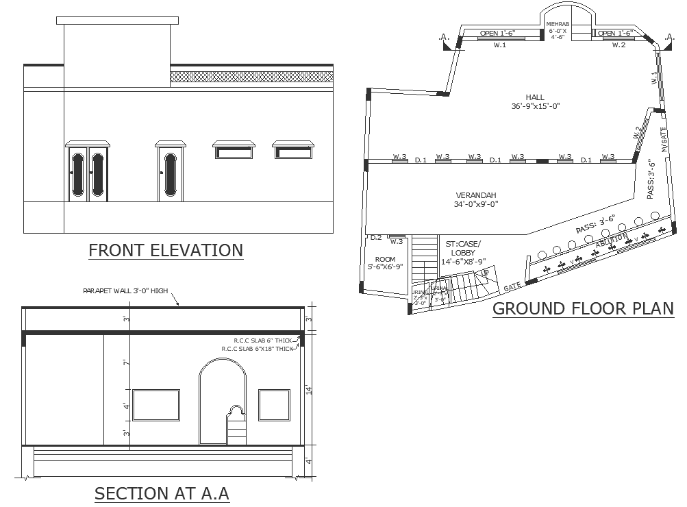 Mosque design with 34 X 9 ft verandah space detailed plan section and elevation DWG autoCAD drawing