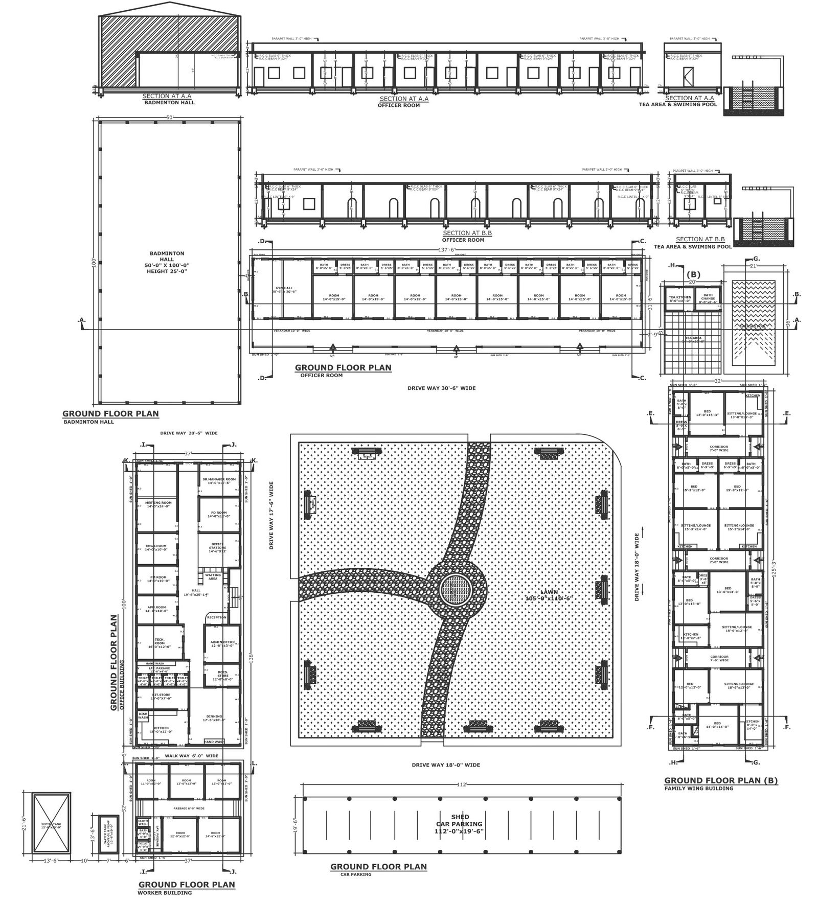 Office building and staff quarter design with lawn area detailed plan sections and elevation DWG autoCAD drawing