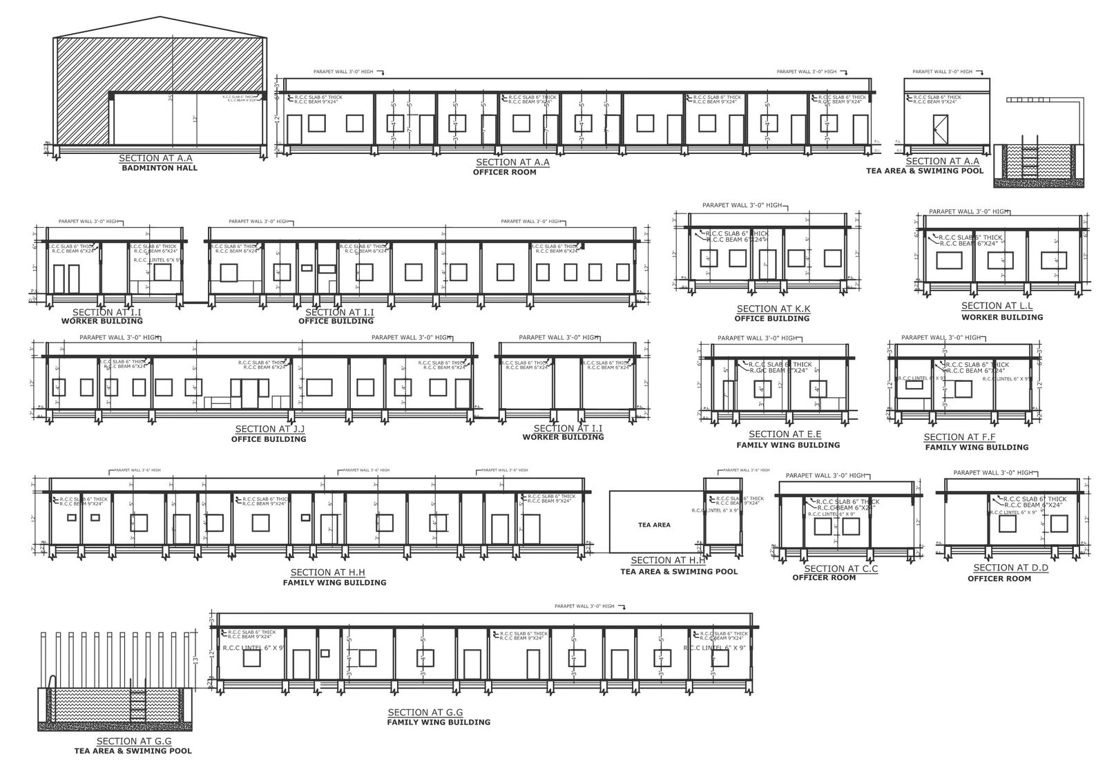 Section details for different buildings like offices family wing worker building and swimming pool DWG autoCAD autoCAD