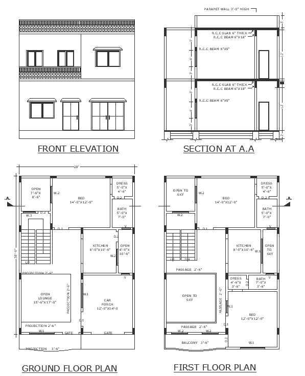 15.5X17 ft open to sky lounge design in double storey house detailed floor plan section and elevation DWG autoCAD drawing