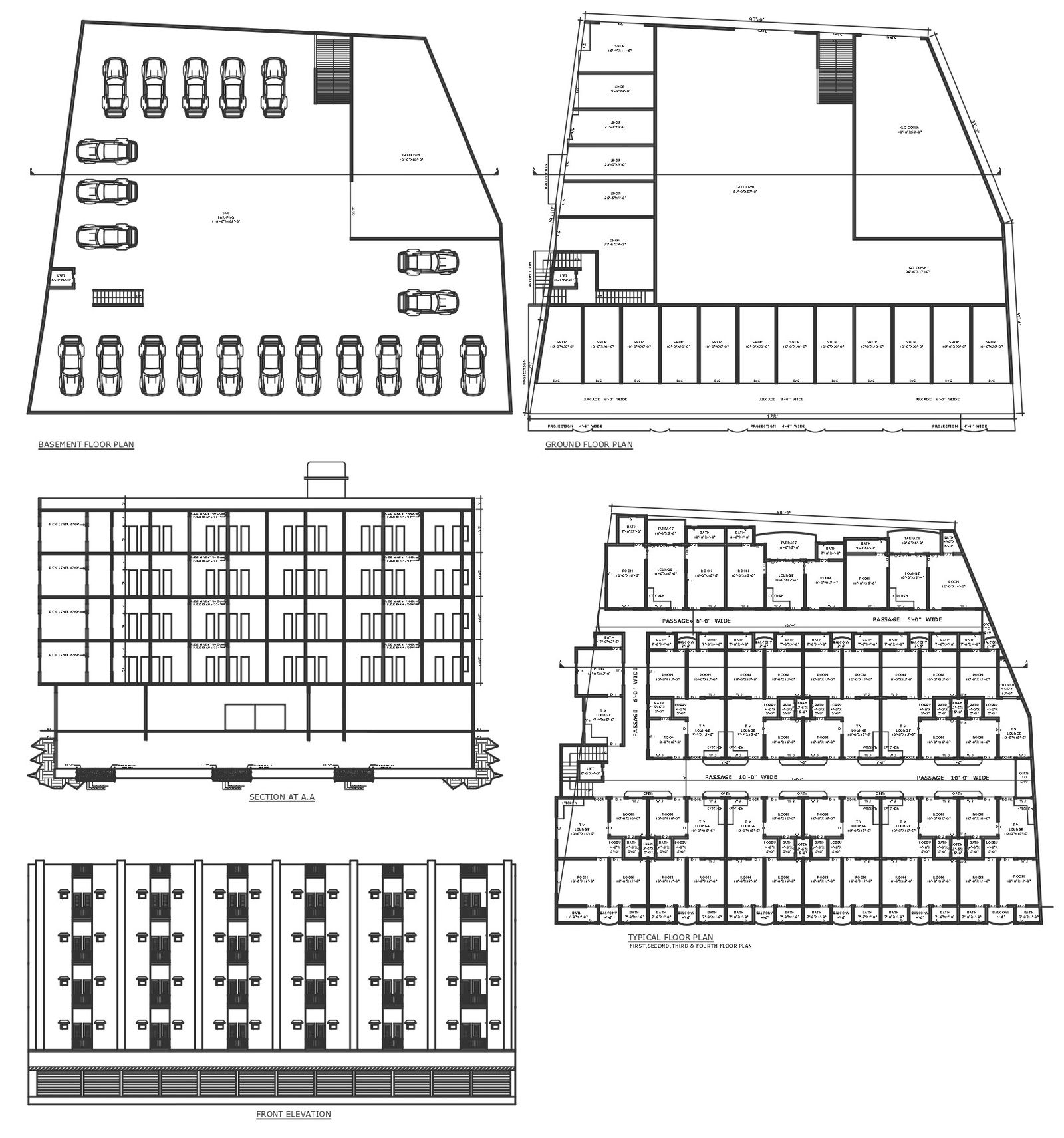 Three bhk low rise apartment design with basement parking detailed layout plan section and elevation DWG autoCAD drawing