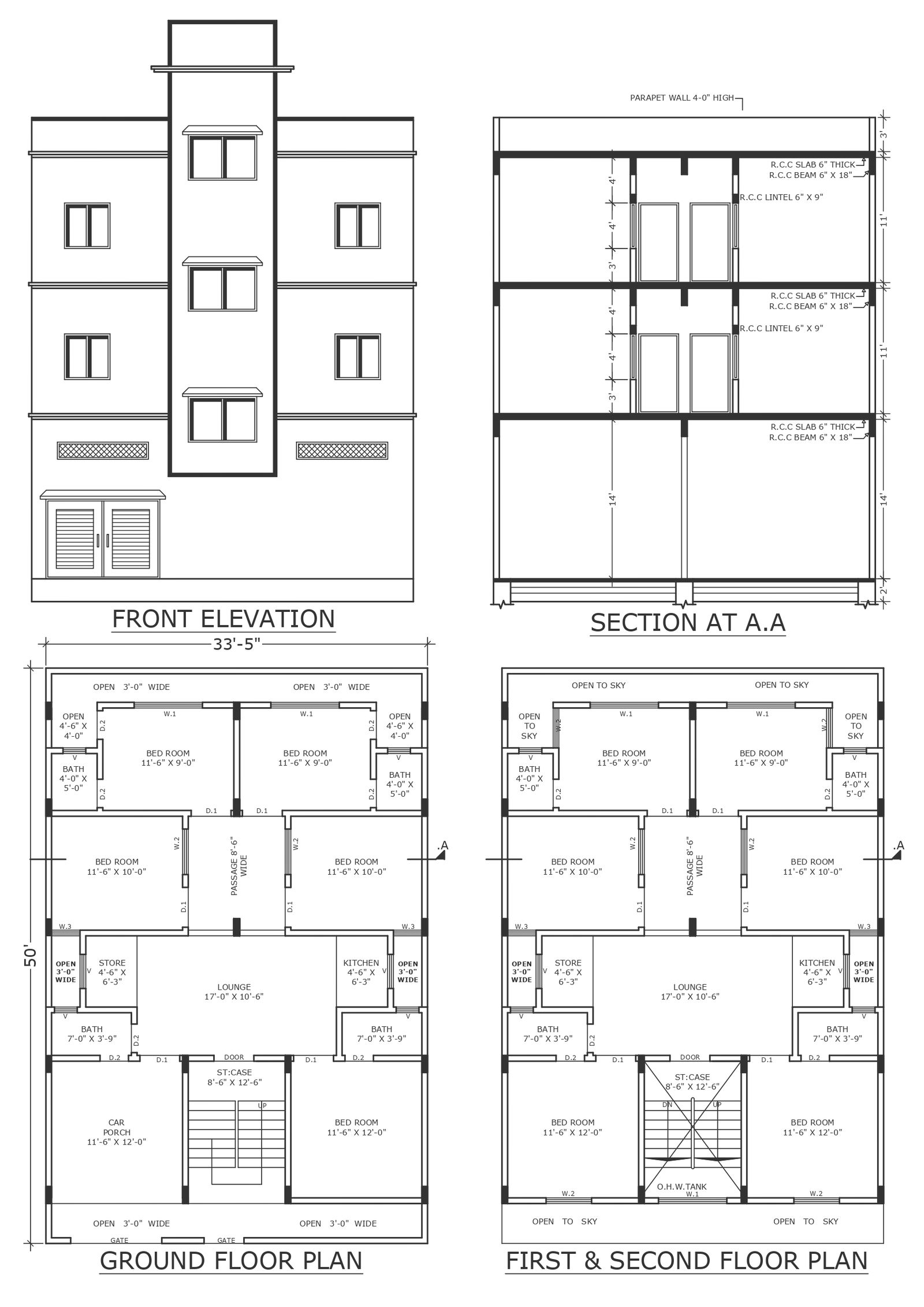 33.5X50 ft plot size three storey apartment design detailed plan section and elevation DWG autoCAD drawing