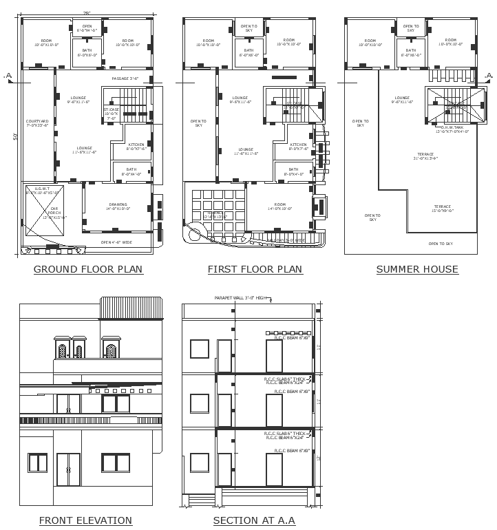 28X50 ft three storey house design detailed floor plan section and elevation DWG autoCAD drawing
