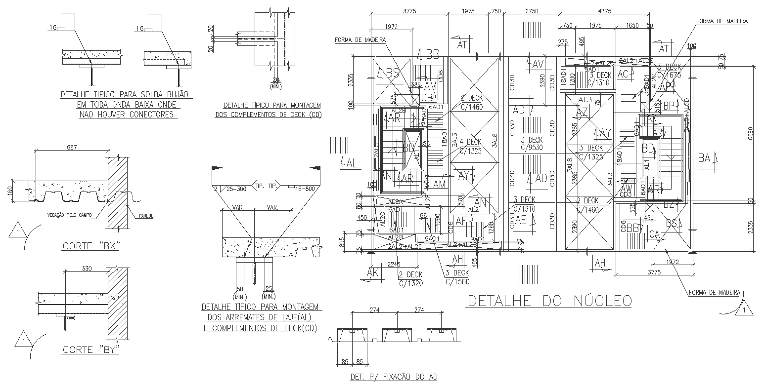 This comprehensive AutoCAD drawing presents essential core and assembly details for slab finishes and deck complements. The drawing highlights critical elements of steel deck structures, emphasizing cross-sections and assembly configurations for efficient construction practices. Key features showcased include steel deck details, cross-sectional views, and typical assembly components. This drawing is invaluable for understanding wall framing, pillar specifics, flooring, elevation considerations, and space planning. It provides crucial insights for column layout, section detailing, facade design, architecture, interior design, and concrete construction. Explore this CAD file for detailed documentation on beam and column specifications, foundation plans, and reinforcement details. This comprehensive drawing aids architects, engineers, and construction professionals in project planning and execution, ensuring accurate and efficient implementation of slab finishes and deck complements.