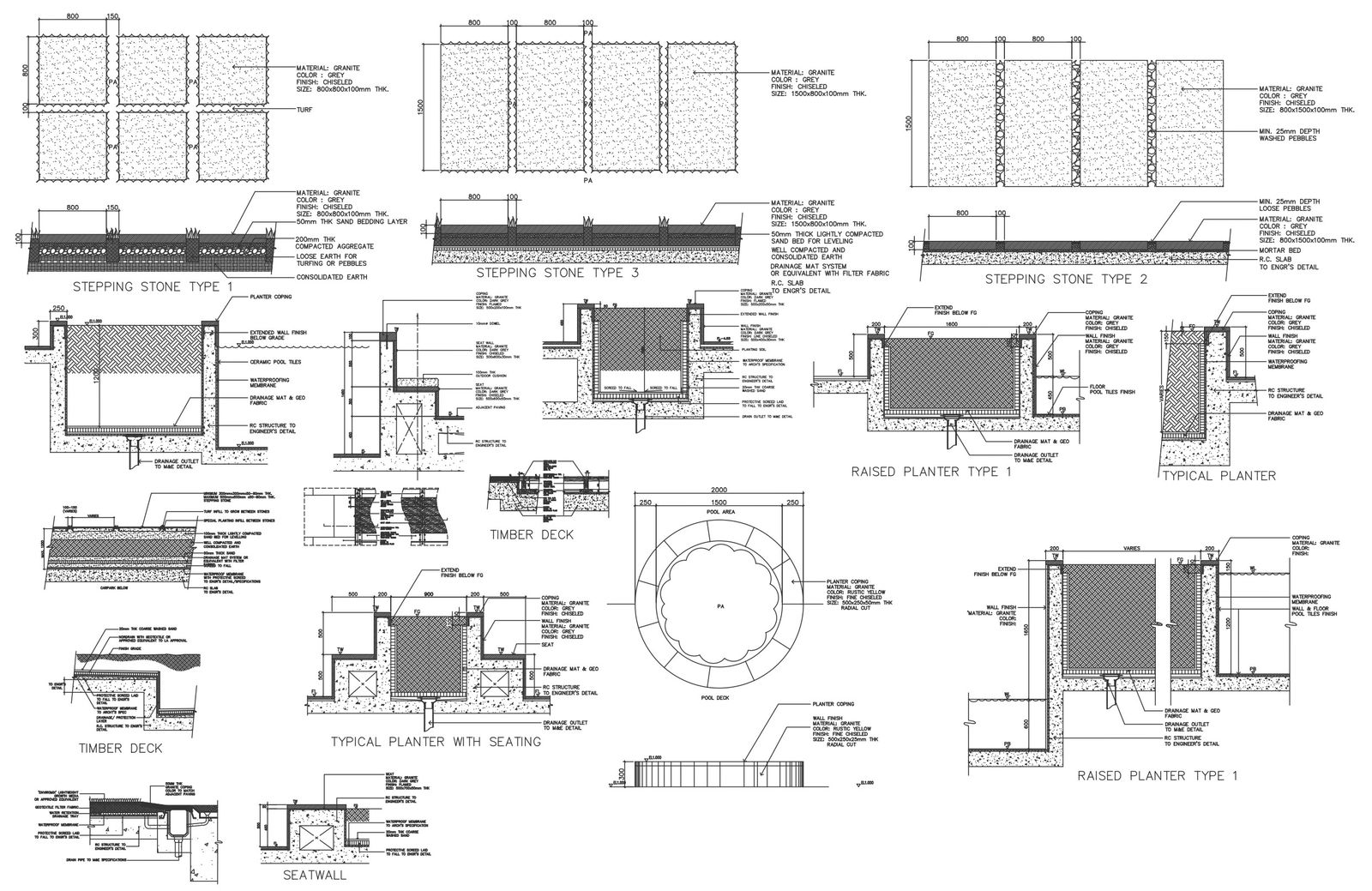 Explore the intricacies of landscape design with this detailed AutoCAD drawing showcasing various types of stepping stones, planters, and timber deck details. This comprehensive drawing provides insights into the arrangement and specifications of different landscaping elements. Discover different styles and shapes of stepping stones, each designed to enhance pathways and outdoor spaces. The planter details highlight various configurations suitable for incorporating greenery and plants into the landscape. Additionally, explore timber deck details, illustrating how timber elements can be integrated into outdoor spaces for seating or decorative purposes. The drawing includes elevation and section details, offering a holistic view of how these elements interact with the overall landscape design. This resource is invaluable for architects, designers, and landscapers looking to enhance space planning, layout, and construction detailing.