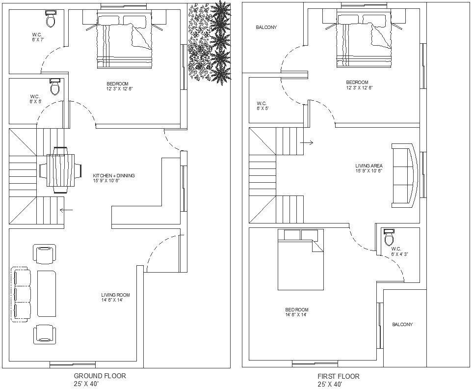 Two storey house three bed room design on plot size of 25X40 ft DWG autoCAD drawing