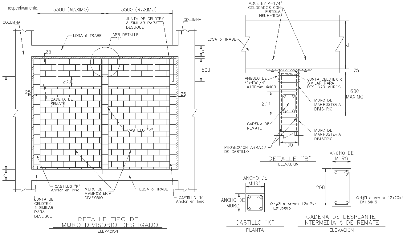 Detail of division wall plan section and elevation DWG autoCAD drawing