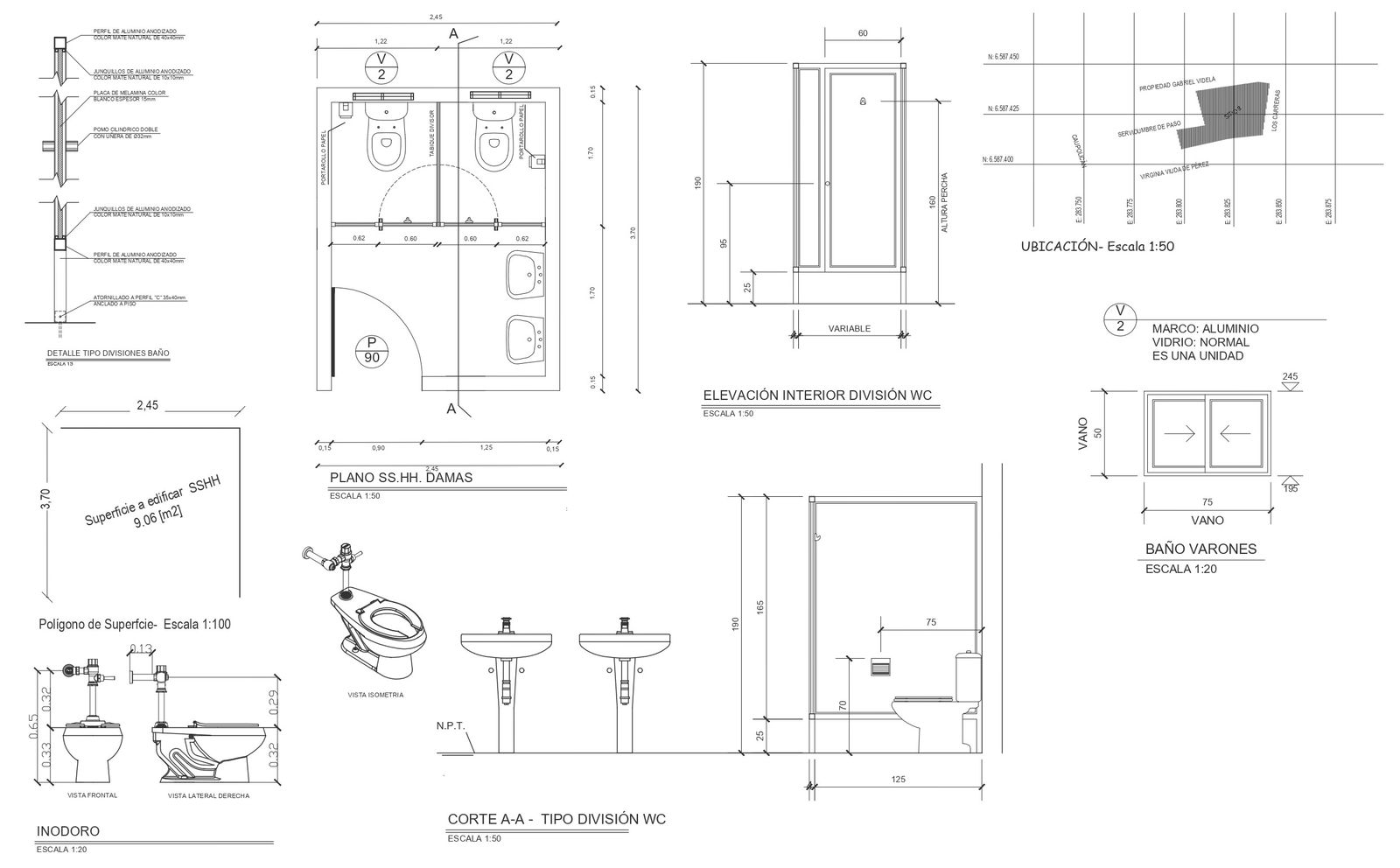 General section details of the bathrooms construction system DWG autoCAD drawing
