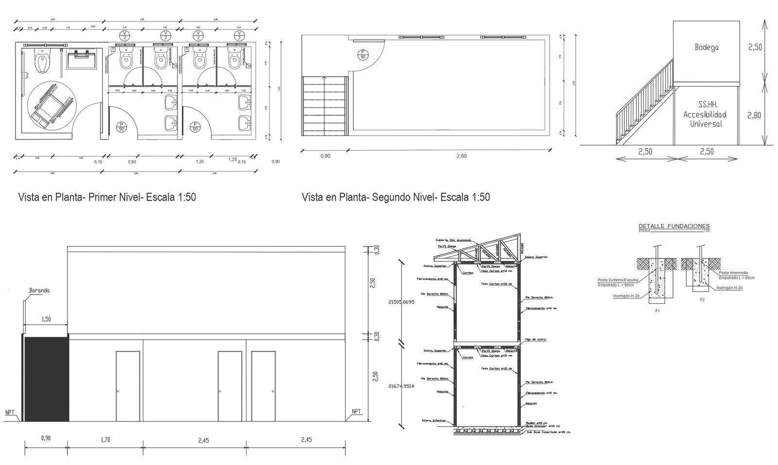 Plan view of first and second level of washroom and foundation detail DWG autoCAD drawing