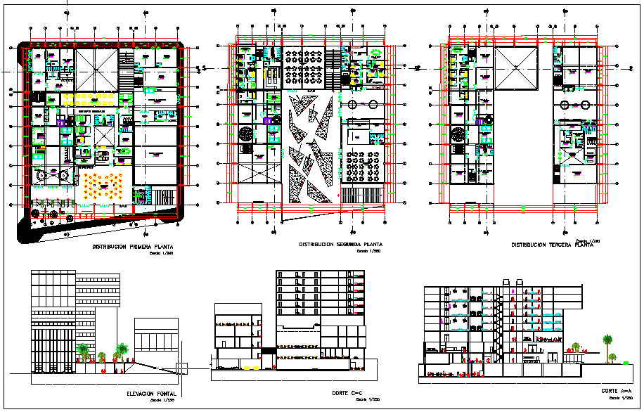 Five Star Hotel And Convention Center plan layout and elevation view that includes tree view entrance, elevation view of floors, dinning area, bedrooms, convention hall, front and side elevation views and much more of Five Star Hotel And Convention Center.