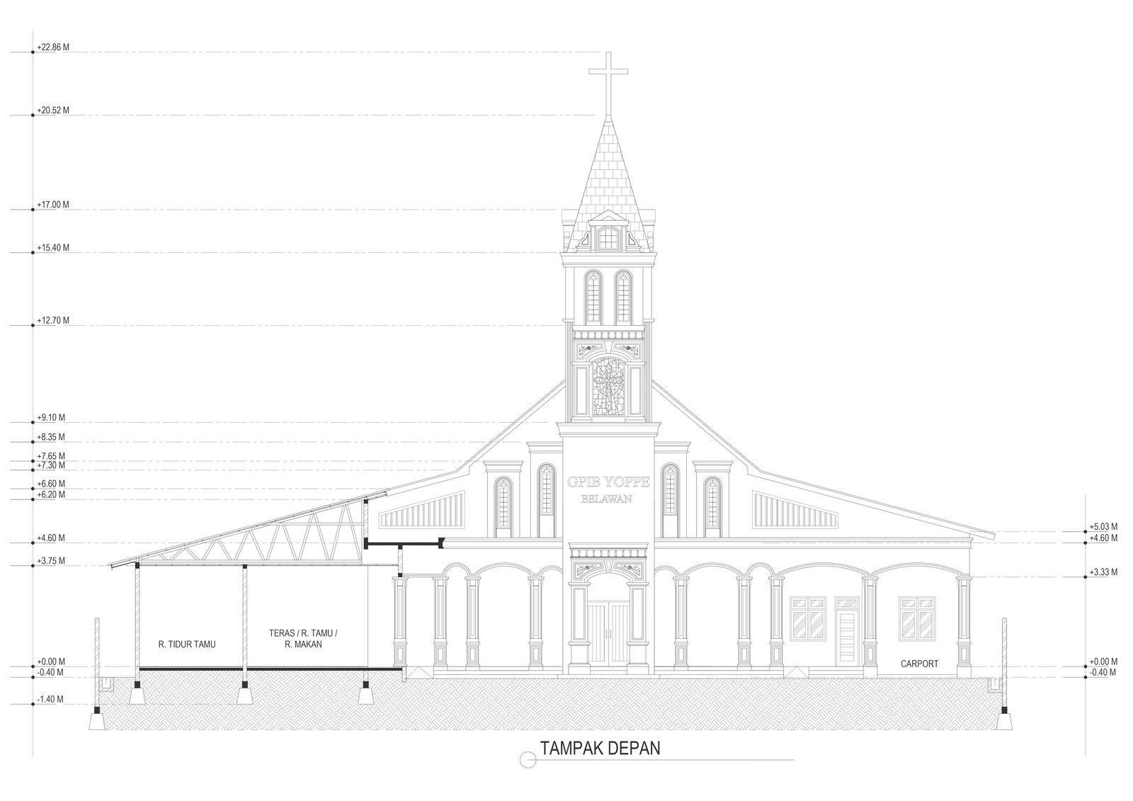 Explore the detailed front elevation of a church, showcasing all level heights, in our AutoCAD DWG drawing. This comprehensive blueprint highlights the architectural design and structural elements of the church facade, emphasizing the intricate details of its elevation and height levels. Dive into the elevation details, revealing the facade design, architectural features, and proportions that define the church's visual presence. Discover how the space planning and layout considerations contribute to the overall aesthetic and functionality of the church design. This CAD file serves as a valuable resource for architects and designers, providing insights into church architecture and urban design. Whether refining existing plans or conceptualizing a new church project, leverage this digital blueprint to enhance your architectural design with precision and practicality. Unlock the potential of church architecture with this detailed drawing, optimized for aesthetic appeal and architectural excellence.