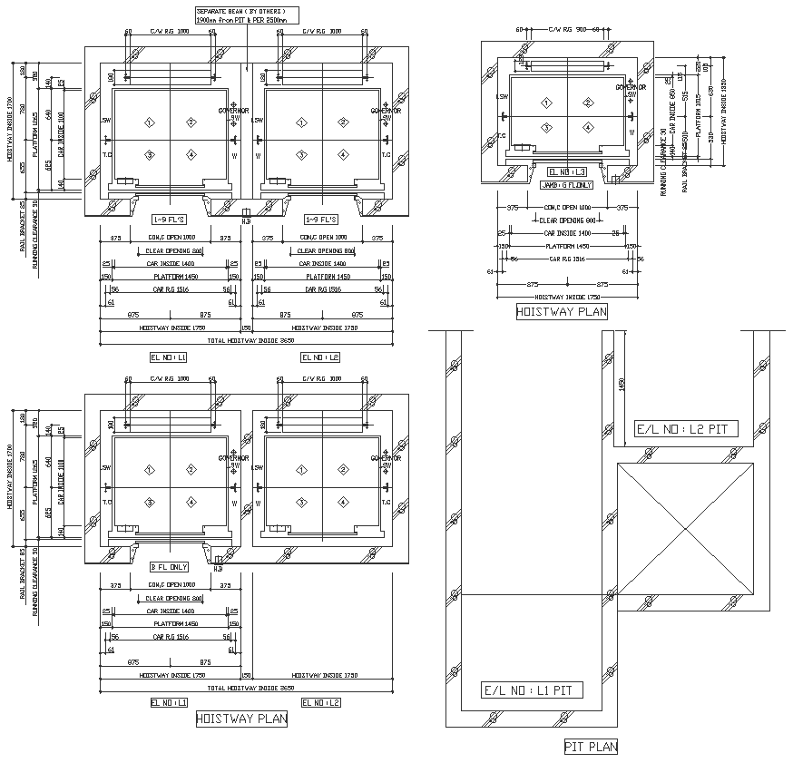 Hoistway plan with pit plan and beam details dwg autocad drawing .