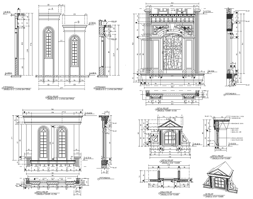 Ancient Gothic style window design for Jendela tower detailed sections DWG AutoCAD drawing