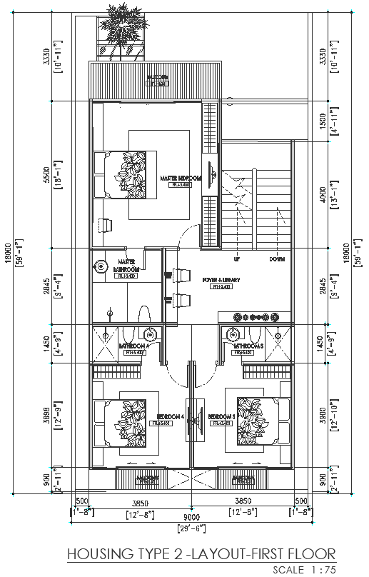 Three bedroom design on first floor of house DWG AutoCAD drawing