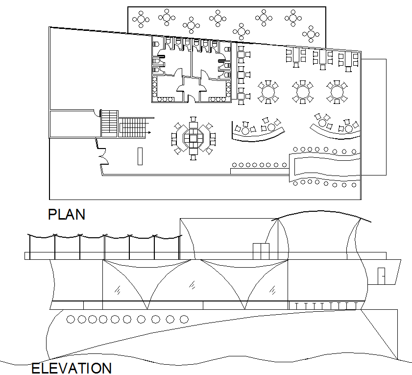 This boat restaurant cad drawing provides a detailed 2d layout suitable for architectural and interior planning purposes. The drawing includes a complete plan view that shows the arrangement of seating areas and service spaces, along with furniture placements for spatial clarity. An elevation view is also included to help users understand the external structure and design aesthetics of the restaurant. This drawing supports concept visualization, structural referencing, and design decision-making for waterfront restaurant projects or floating dining concepts. It is useful for designers who need accurate dimensional and spatial references when planning interior arrangements and operational flow.