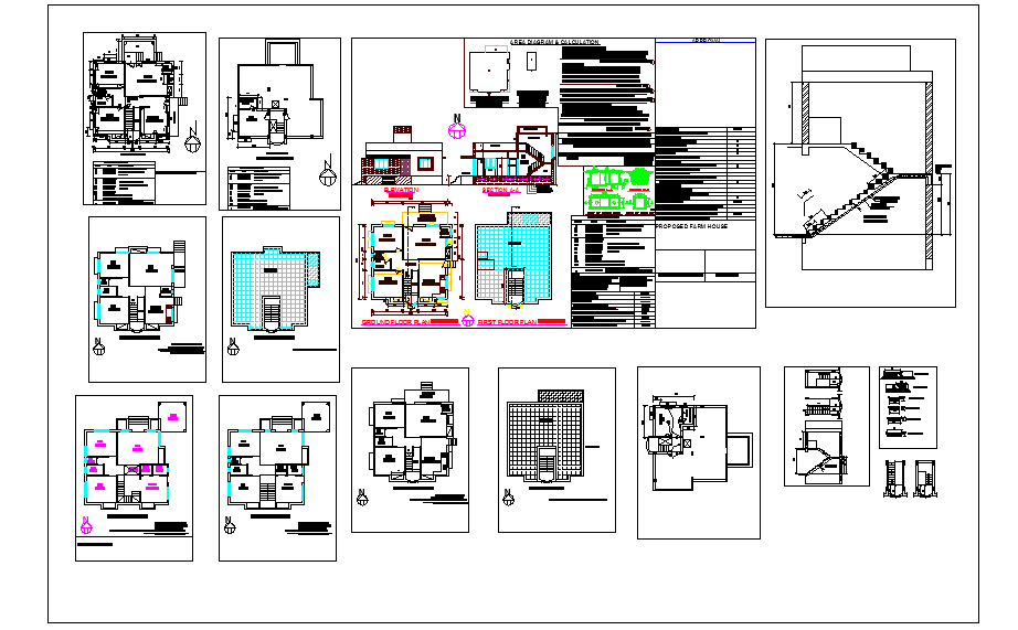 Farm House Design With Plan and Elevation view that includes ground floor plan, first floor plan,terrace, bedrooms, kitchen, elevation view of floors, section plan, living room, store room,and much more of farm house design.
