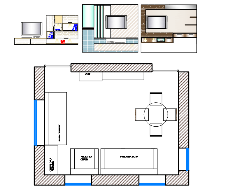 tv unit designs file, layout plan of a room, this file consists of tv unit designs and layout plan of a room in auto cad file