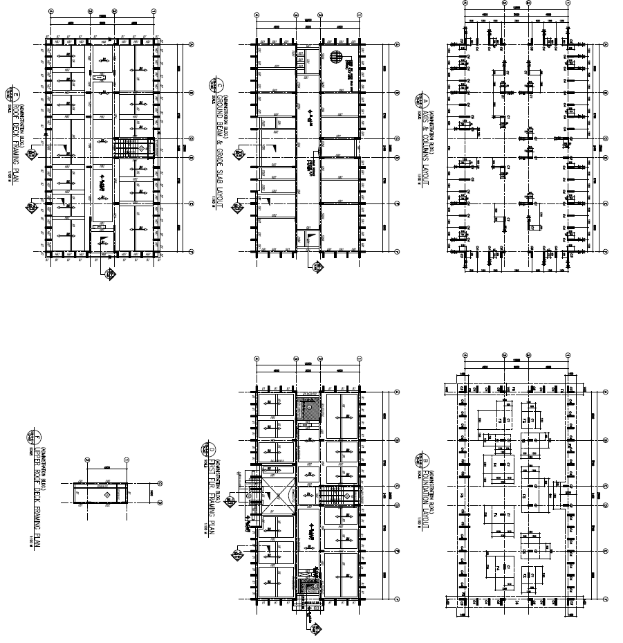 Civil Defense Construction Plan dwg file. columns Layout plan, ground beam $ grade slab layout, first floor framing plan, upper roof desk framing plan, roof desk framing plan and foundation plan