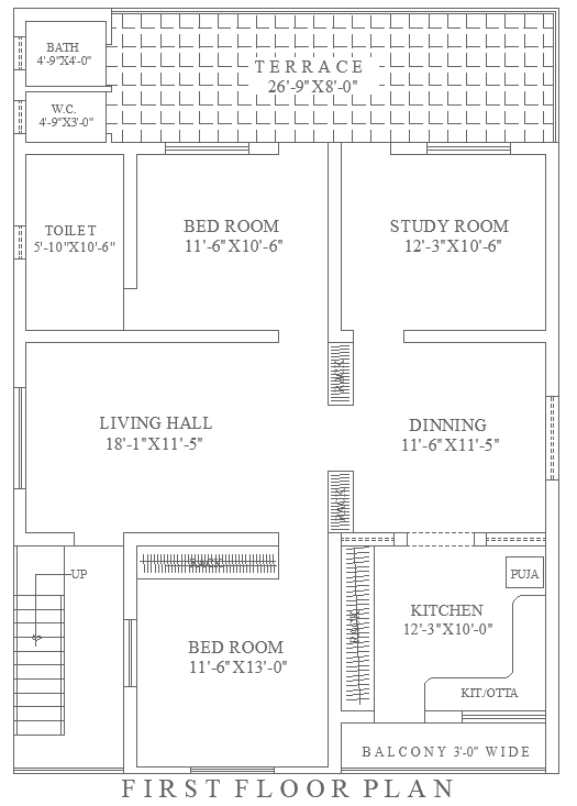 This first floor plan features a well-organized 32.7ft x 45.9ft layout, designed for modern family living. The house plan includes two spacious bedrooms, a dedicated study room, an open living hall, a dining area, and a modern kitchen complete with a puja room and kit/otta space. Additionally, the plan provides two separate toilet areas for convenience and privacy. The layout is enhanced by a large terrace area, offering ample outdoor space, along with a 3'0" wide balcony. The AutoCAD DWG file included allows for precise architectural detailing, making it perfect for builders, architects, and homeowners looking for a clear and functional house design.