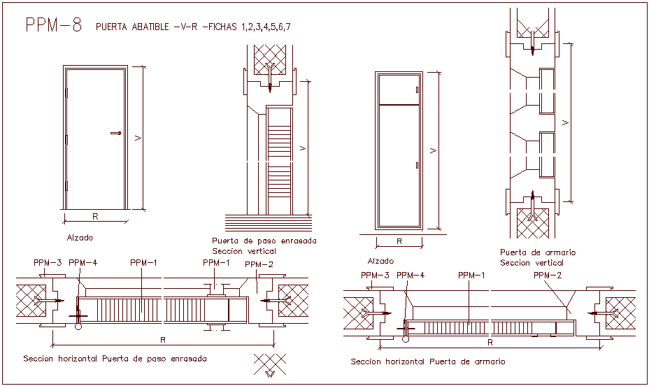 Closet door design view with sectional view dwg file with view of door and door dimension view and view of door handle and sectional view with frame and wall with door mounting view.