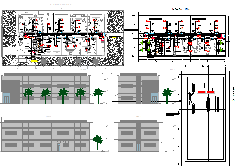 Feed mill factory administration building .with interior plan and exterior elevation of ground plus one floor with planning of interior furniture placing according to department like reception accounting manager office production manager office data processing room switch board room meeting room couriers room cafeteria general manager room secretary room directional office, and includes roof plan and exterior elevations.