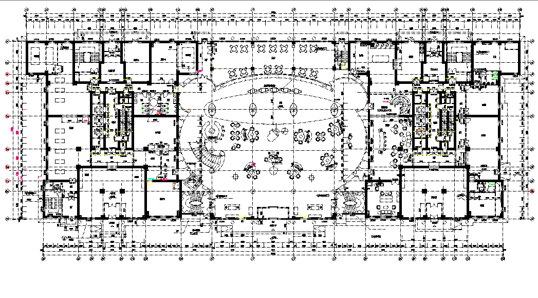 Bar and restaurant interior plan with bar counter staircase detail placing of furniture kitchen detail waiting rest room with detailed dimensions.