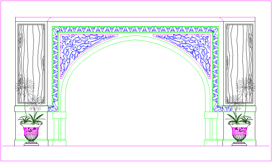 Islamic art with flower shaped design in door with designer column and flower pot view in both side.