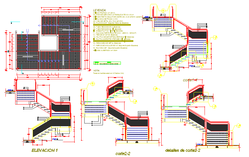 Stair detail include the plan detail, section, top plate e = 1/2 "(rail), rectangular steel tube 35 x 6 cm e = 5mm (step), 1/2 "anchor bolt (top ladder bracket), Cut details 2-2. all side elevation & detail & section also include the file.