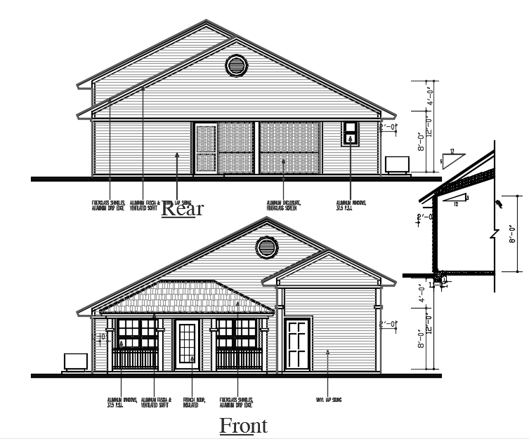Elevation of House.detailed elevation showing dimension of doors windows and detail of vinyl lap siding fiberglass shingles,aluminium drip edge french door insulated aluminium fascia and ventilated soffit aluminium enclosure ,fiberglass screen.