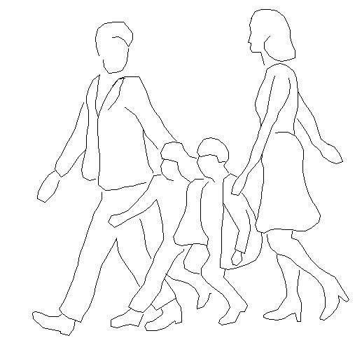 This AutoCAD DWG file features a detailed 2D family people CAD block designed in a front view. The drawing illustrates a walking family group, including two adults and two children, with accurate body proportions and natural postures. Each human figure is represented with smooth linework and proper scaling, making it ideal for inclusion in architectural layouts, park designs, public spaces, or interior drawings. The linear outlines maintain visual consistency, ensuring easy adaptation in both residential and commercial planning drawings.
