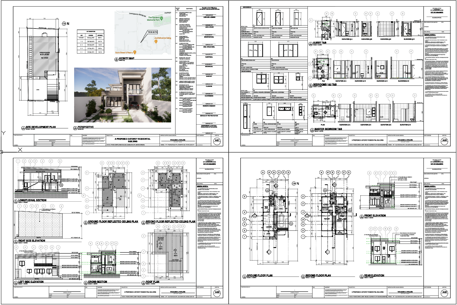 This AutoCAD DWG file provides a complete modern two-storey residential building plan designed on an approximately 6m by 22m site, offering clear and accurate architectural details for professional use. The drawing set includes a fully dimensioned site development plan, a detailed vicinity map, and a high-quality perspective view that illustrates the front façade and exterior landscape. The ground-floor layout features spaces arranged with precise measurements, while the second-floor plan highlights bedroom zones, circulation areas, and sanitary positions. Users also get access to reflected ceiling plans, roof plans, and complete elevation drawings, ensuring they can understand both the structural and aesthetic components of the residential design. Each sheet is arranged with clarity, making it suitable for architectural presentations, design approvals, and planning submissions.